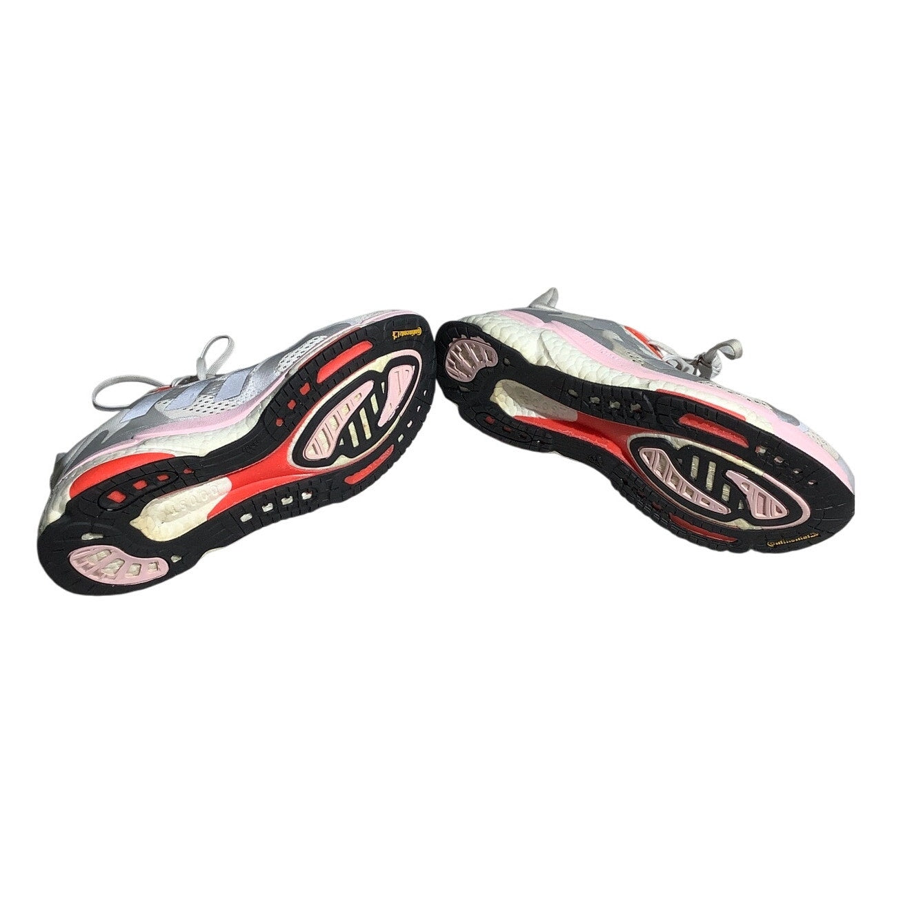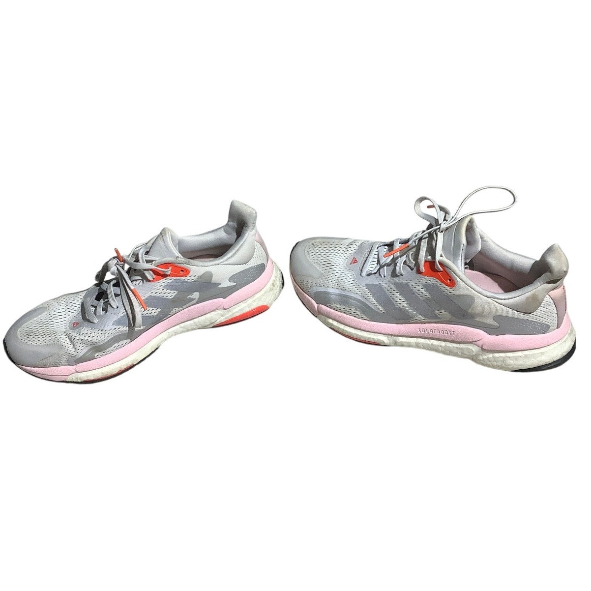 Adidas Solar Boost 21 running shoes in women’s size 9, featuring a grey mesh upper with Fresh Candy pink and orange accents. Built with responsive Boost cushioning and supportive design, these sneakers deliver both comfort and energy return for everyday runs or casual wear.
