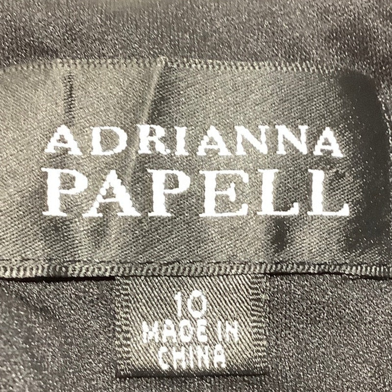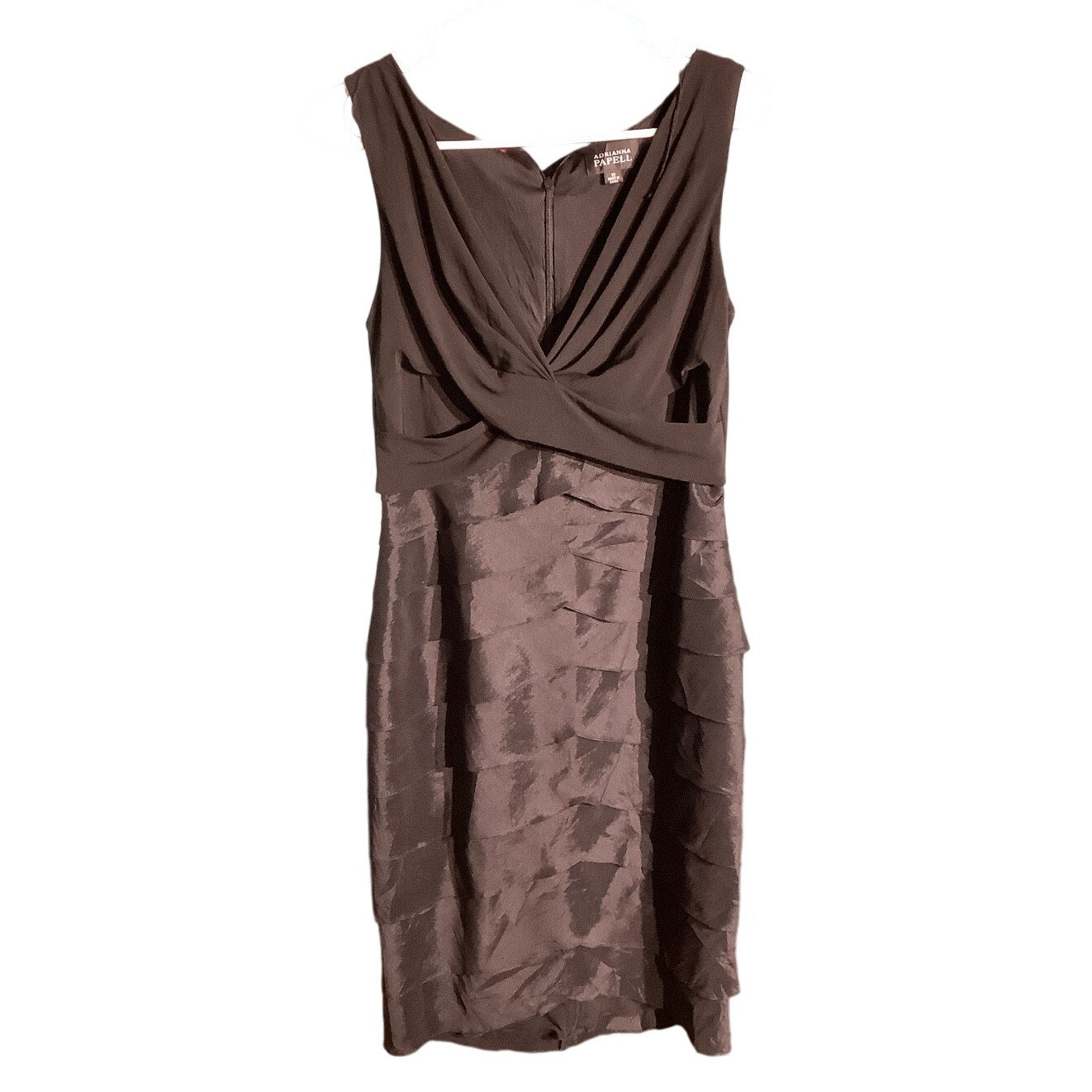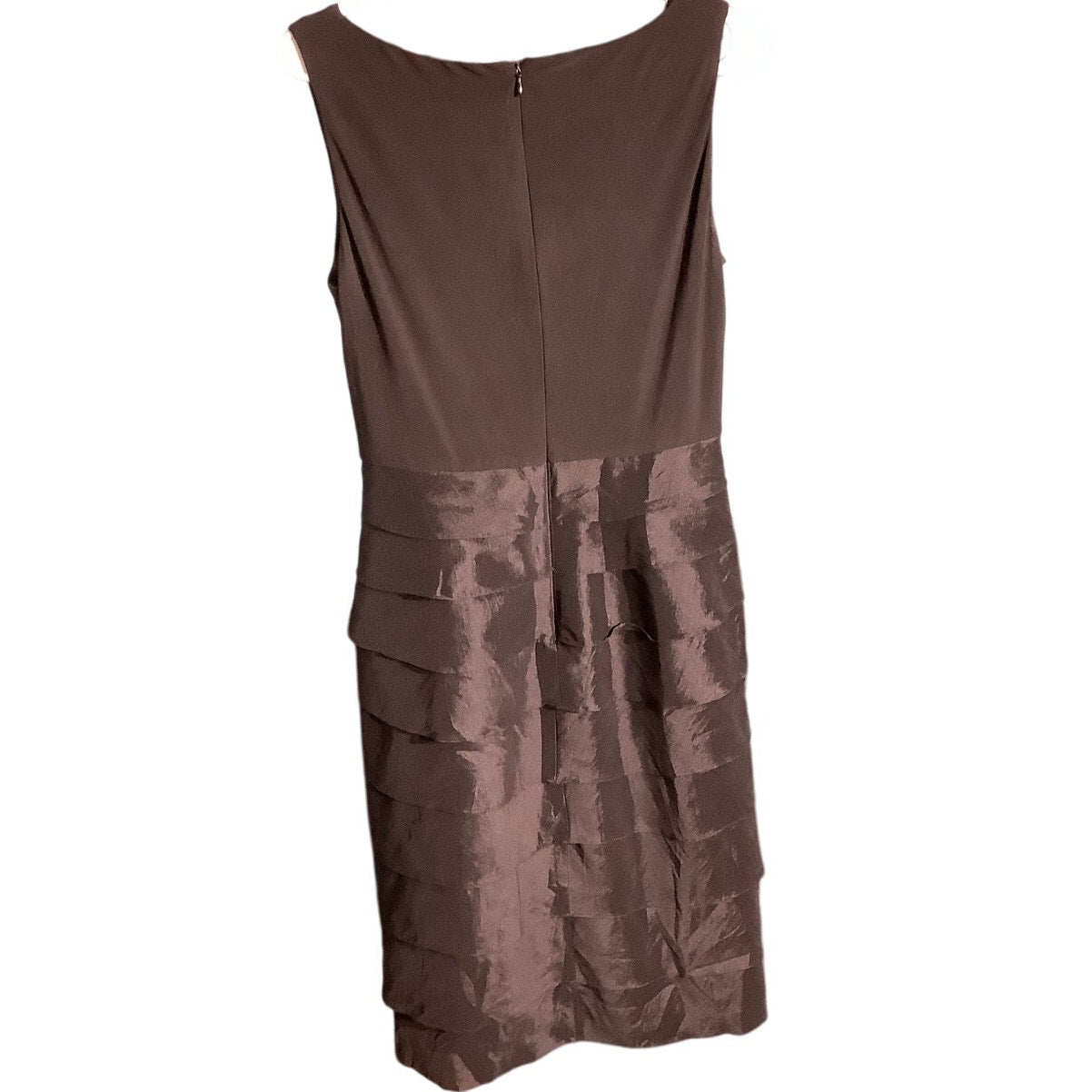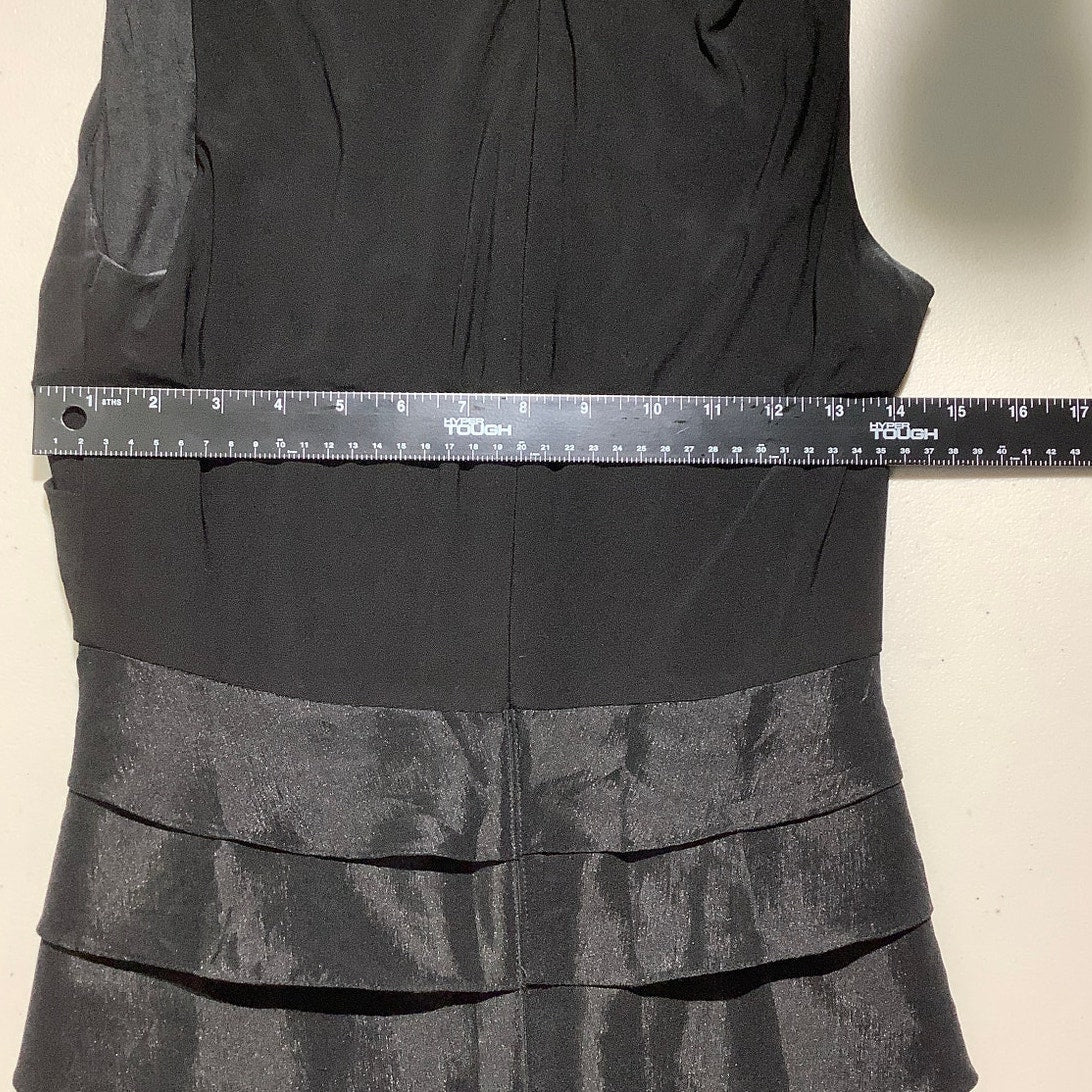 This Adrianna Papell women’s dress in size 10 is a sophisticated piece perfect for special occasions. Designed in timeless black, it features a flattering sleeveless draped bodice with a textured ruffle-tiered skirt that adds depth and movement. The knee-length cut makes it versatile for cocktail parties, evening events, or formal gatherings.