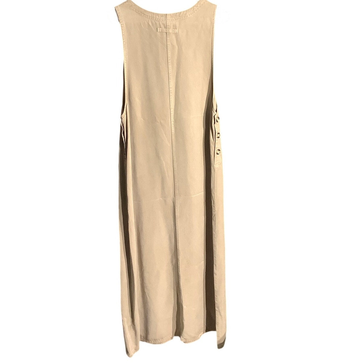 This AKS overall dress features a relaxed, easygoing fit in a versatile beige tone, perfect for casual everyday wear. Designed with a sleeveless silhouette and functional dual front pockets, it offers a comfortable, laid-back utility look that’s easy to style year-round. A small light stain is present and may come out in the wash (see photos), but it does not take away from the overall wearability of the piece.