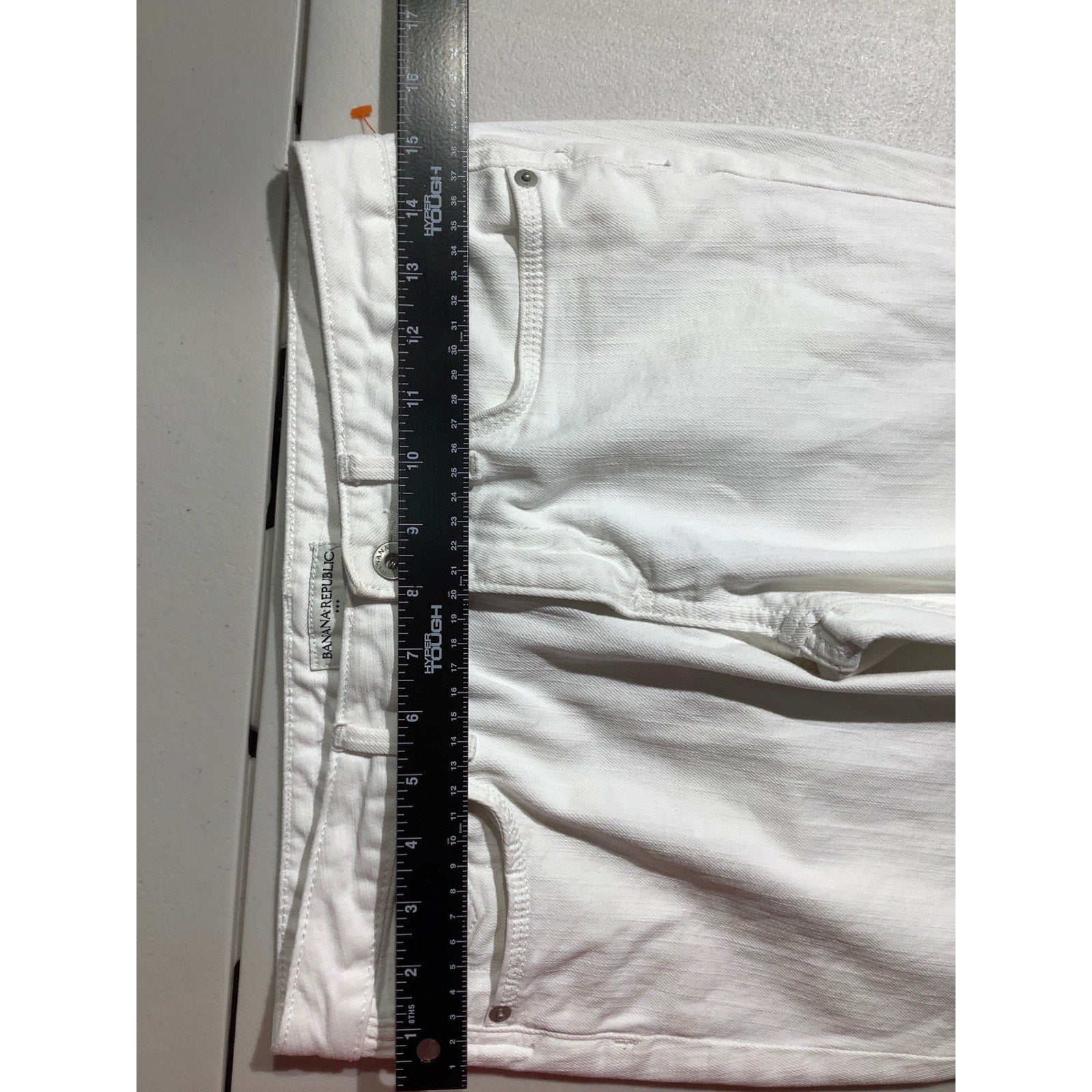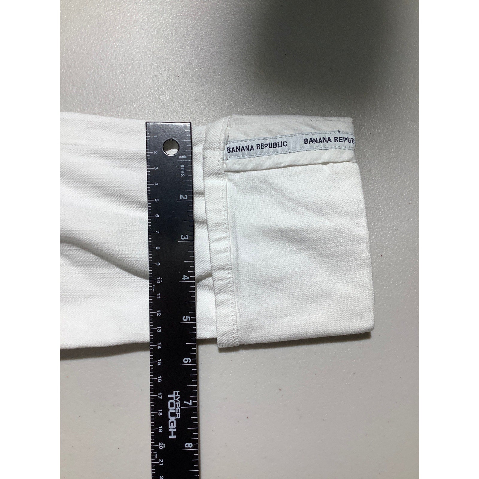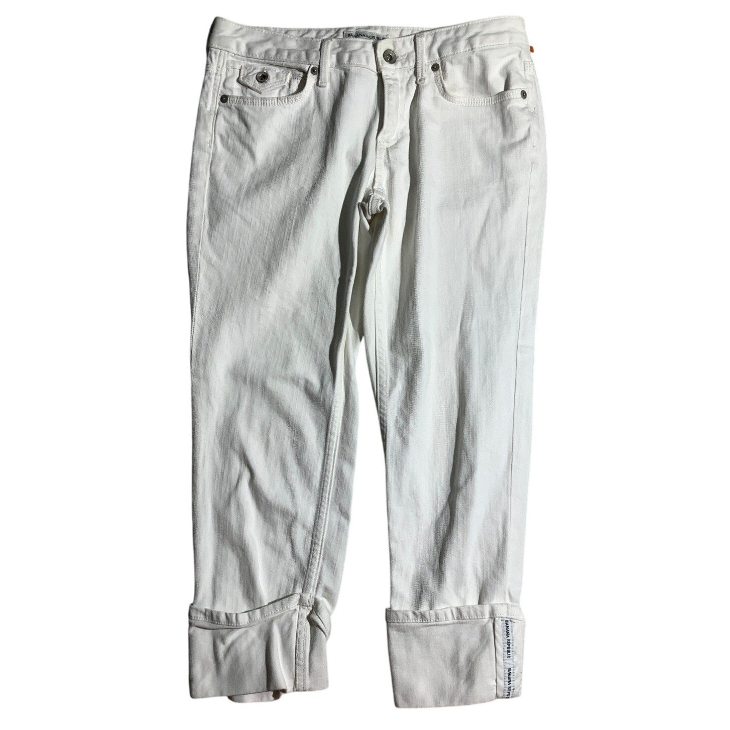 Classic Banana Republic women’s white denim capris, tailored for a flattering slim fit. These cropped pants feature rolled cuffs for a modern casual style, making them versatile for everyday wear, summer outings, or pairing with dressy tops for a polished look.