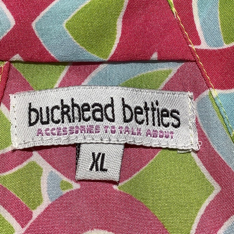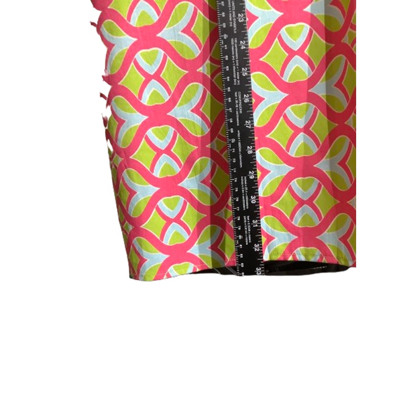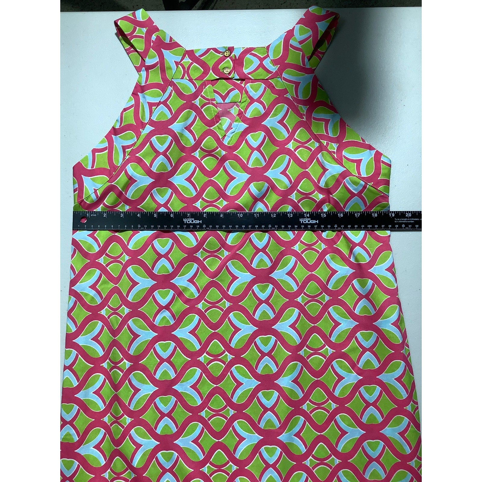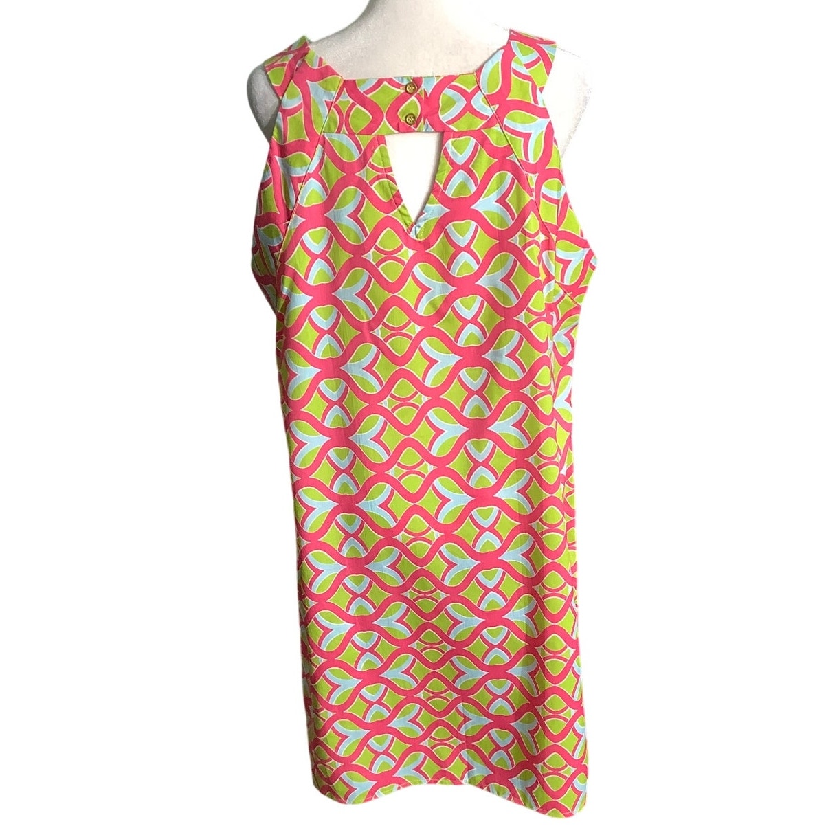This Buckhead Betties women’s sleeveless dress in size XL is a statement piece with its vibrant geometric print in pink, green, and light blue. Made from lightweight fabric, it features a relaxed shift silhouette and a stylish keyhole detail at the back. Perfect for warm-weather days, this dress pairs effortless comfort with eye-catching style.