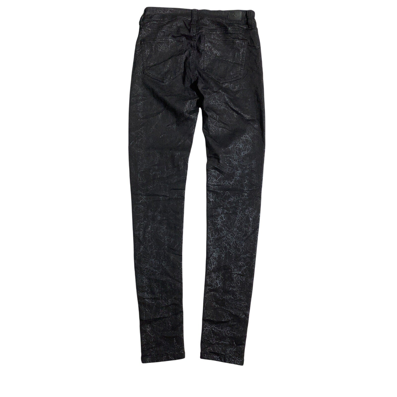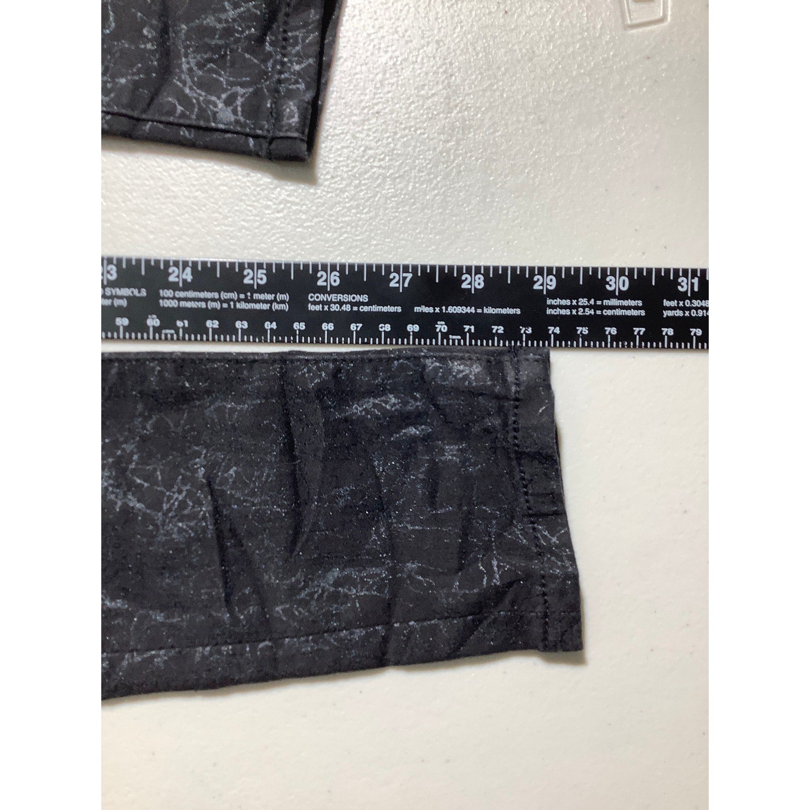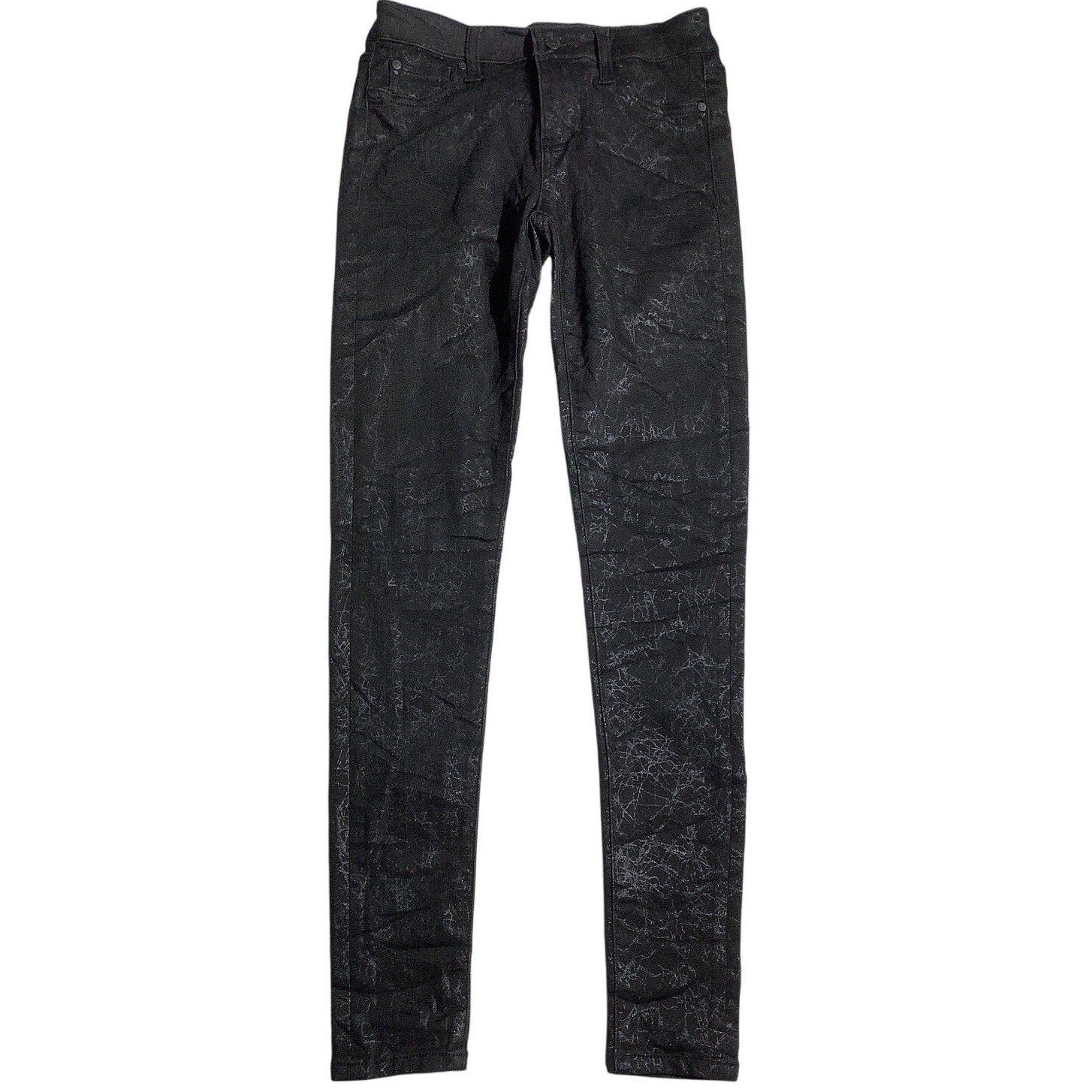 These Celebrity Pink women’s skinny jeans in size 1/25 feature a striking black and metallic silver crackle design, making them the perfect pair for adding edge to your outfit. With a mid-rise fit and a figure-hugging silhouette, these jeans combine comfort with a bold, modern style.