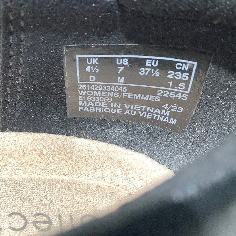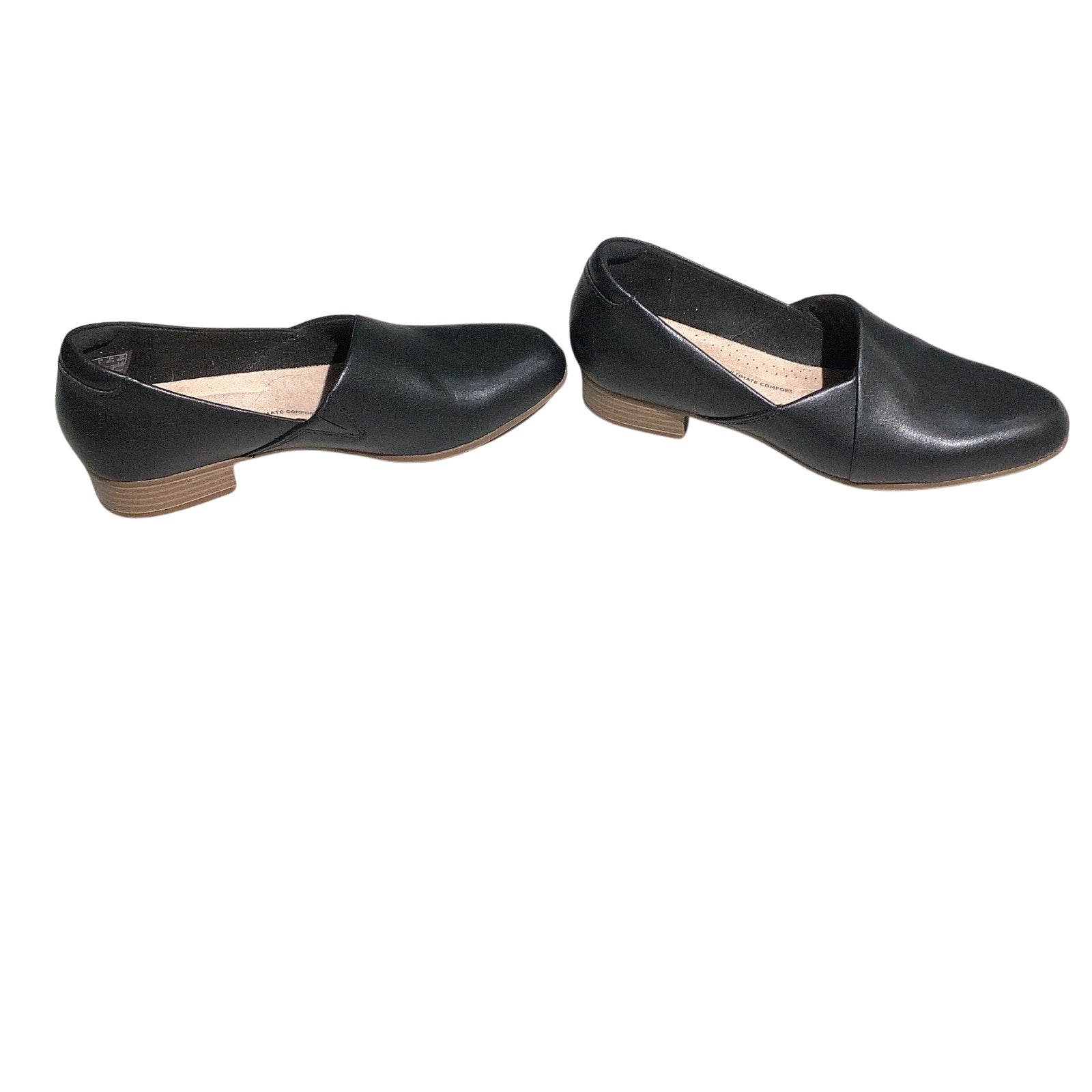 These Clarks Juliet Palm loafers in women’s size 7M feature a sleek black leather upper with a modern asymmetrical vamp. Designed for comfort and versatility, these low-heeled slip-ons offer cushioned insoles and flexible outsoles—perfect for both work and casual wear.