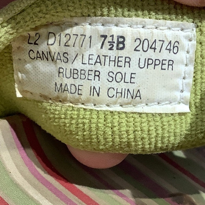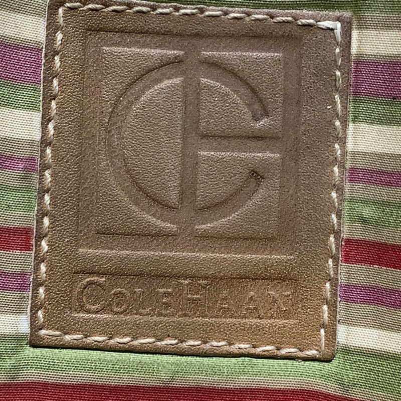 Add a pop of color to your warm-weather wardrobe with these Cole Haan slide sandals featuring tan leather and green canvas cross straps. The striped footbed adds a playful touch, while the cushioned sole ensures comfort with every step. Perfect for casual summer outings, vacations, or everyday wear.