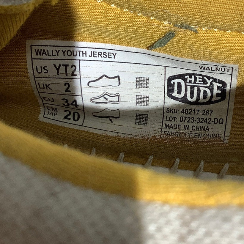 Hey Dude slip-on shoes in a child’s size 2, featuring a walnut beige fabric upper with olive green heel accents and yellow interior lining. Lightweight and breathable with a flexible sole, these shoes are designed for easy wear and all-day comfort. Perfect for casual outings and everyday play.