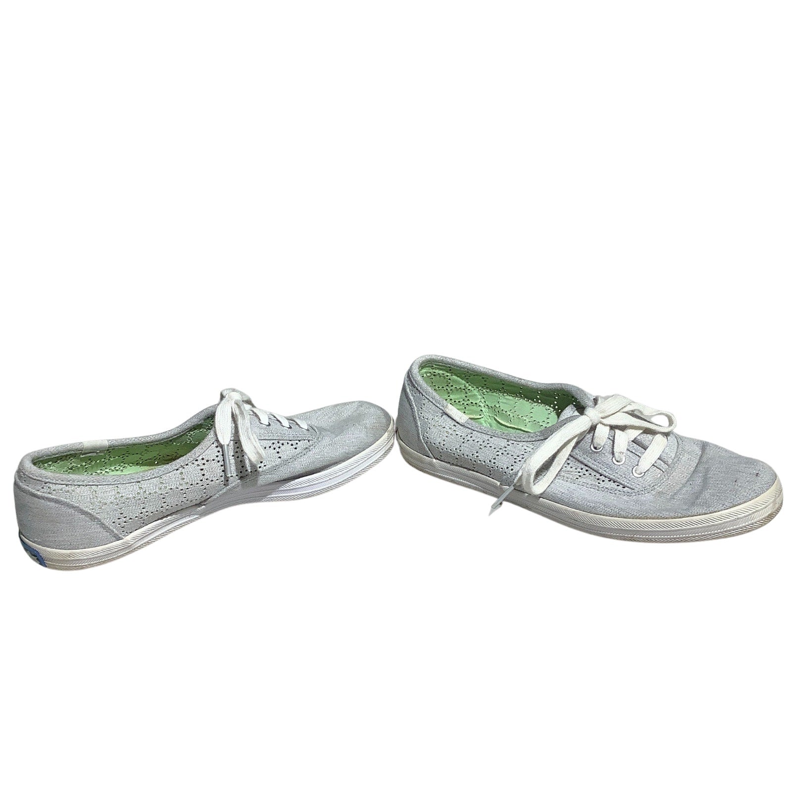 These Keds sneakers in women’s size 6.5 feature a light gray perforated canvas upper that adds breathable comfort and subtle style. With a classic lace-up silhouette and cushioned insole, they’re perfect for casual days and everyday wear.