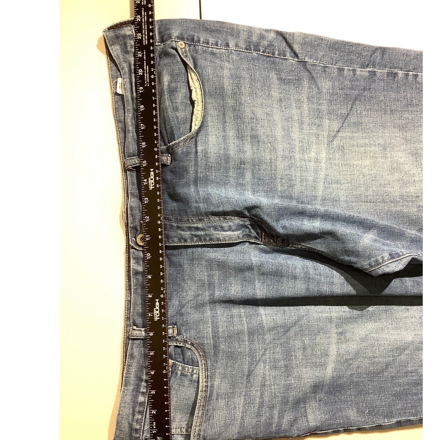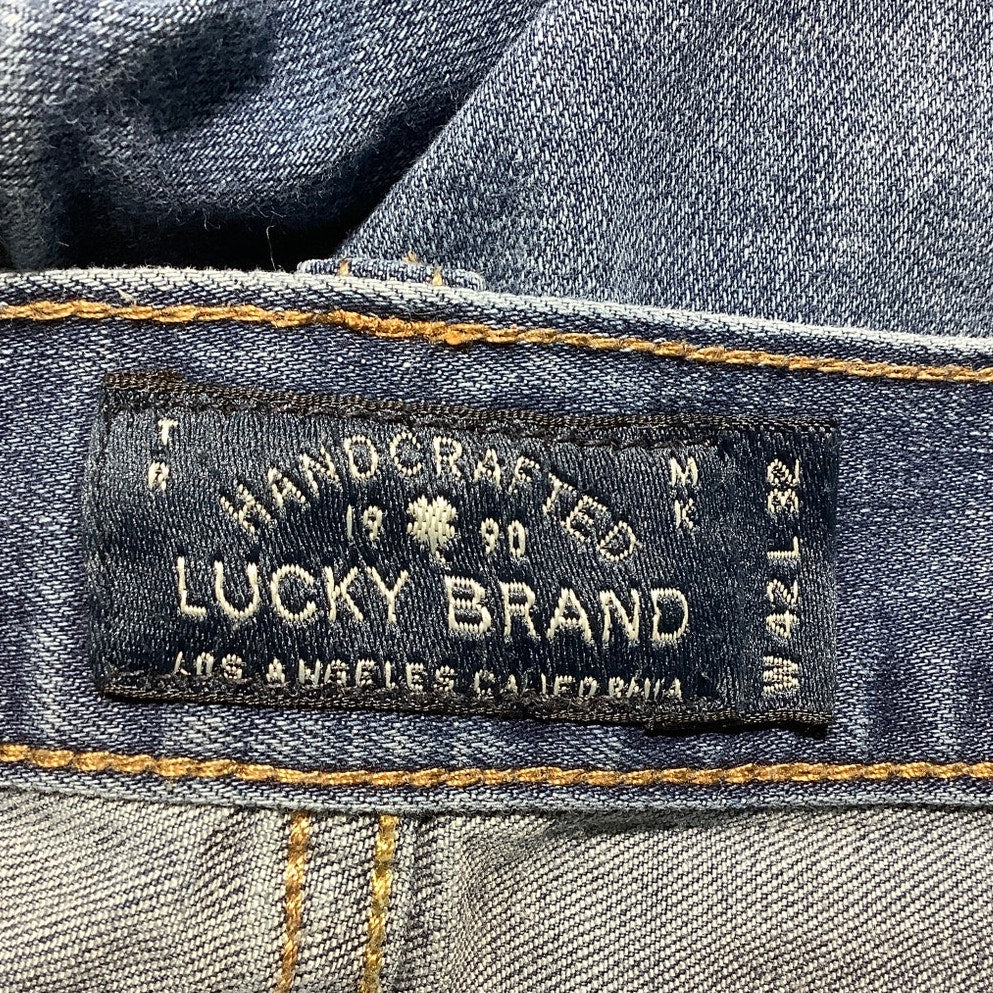 Lucky Brand 410 Athletic Fit men’s jeans in denim blue, size 42W x 32L. Designed with extra room in the seat and thigh while tapering slightly through the leg, these jeans balance comfort and style. The classic mid-rise and straight leg make them a versatile choice for everyday wear.