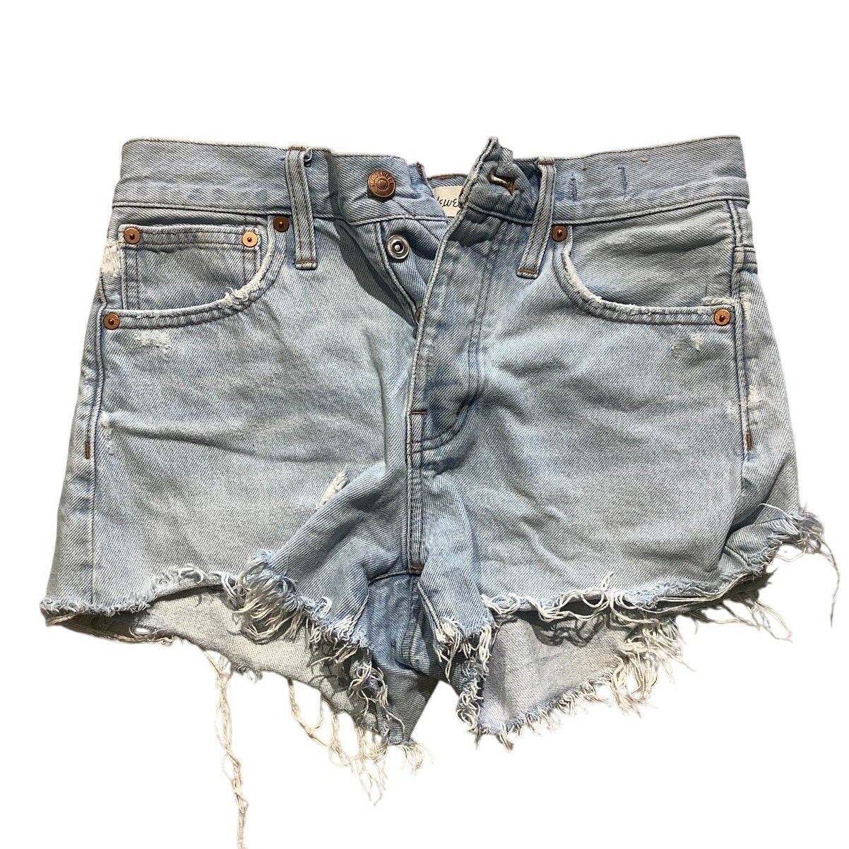 These Madewell light wash denim shorts bring effortlessly cool vibes with a relaxed fit and edgy distressed hem. Made from 100% cotton, they feature frayed legs, a button fly, and classic five-pocket styling—perfect for summer days or layered looks.