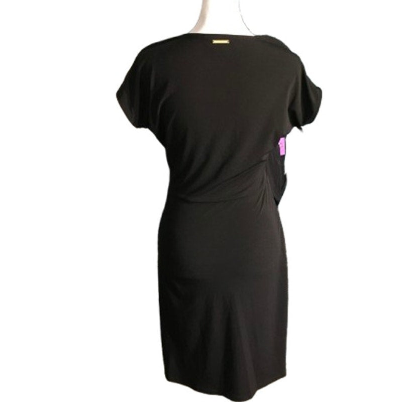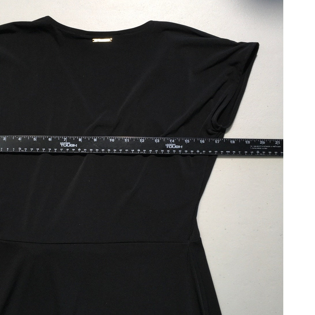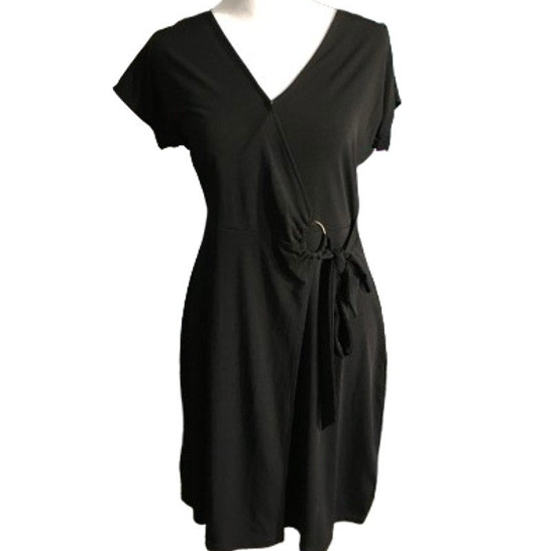 This black Michael Kors dress features a flattering faux wrap design with a gold-tone belt buckle detail that adds a polished touch. The V-neckline and short sleeves make it both stylish and versatile, ideal for professional settings or nights out. Designed to hug and flatter, this piece offers effortless elegance with every wear.
