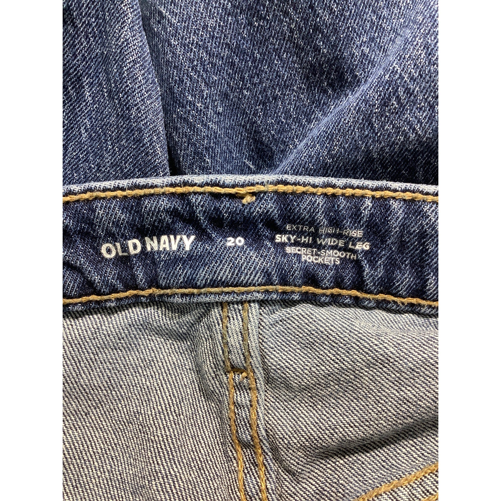 Old Navy women’s Sky-Hi wide leg jeans in denim blue, size 20. Designed with an extra high-rise waist for a flattering silhouette and a relaxed wide-leg cut for modern comfort and style. Crafted from durable cotton denim, these jeans are versatile and perfect for both casual wear and elevated outfits.