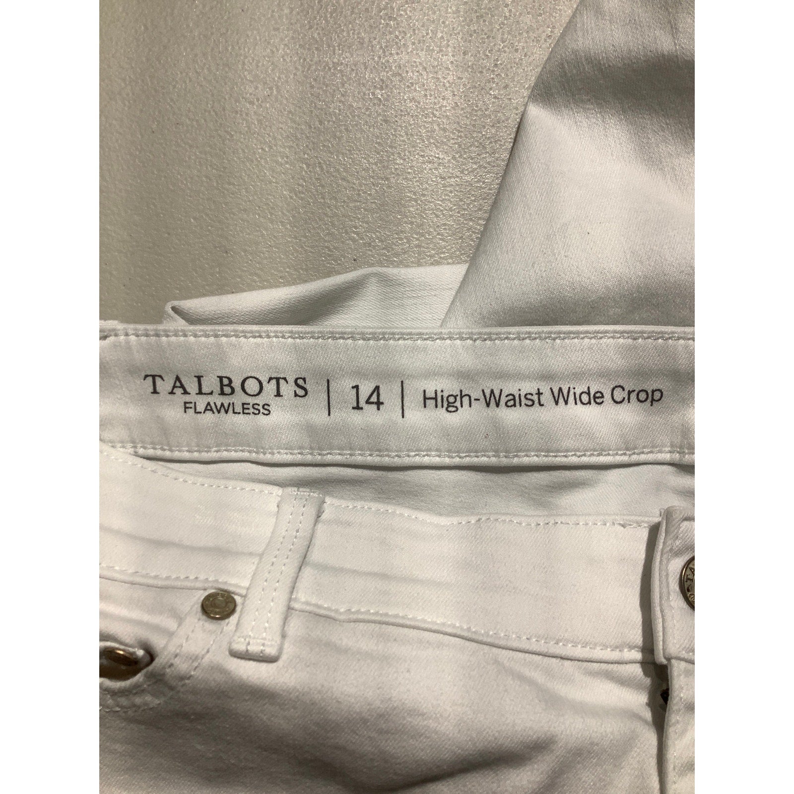 These crisp white Talbots crop pants feature a flattering high-rise fit with a wide-leg silhouette for effortless style. The eyelet embroidery along the scalloped hems adds a feminine touch that elevates any outfit. Perfect for warm-weather days, casual outings, vacations, or pairing with chic tops for a polished look.