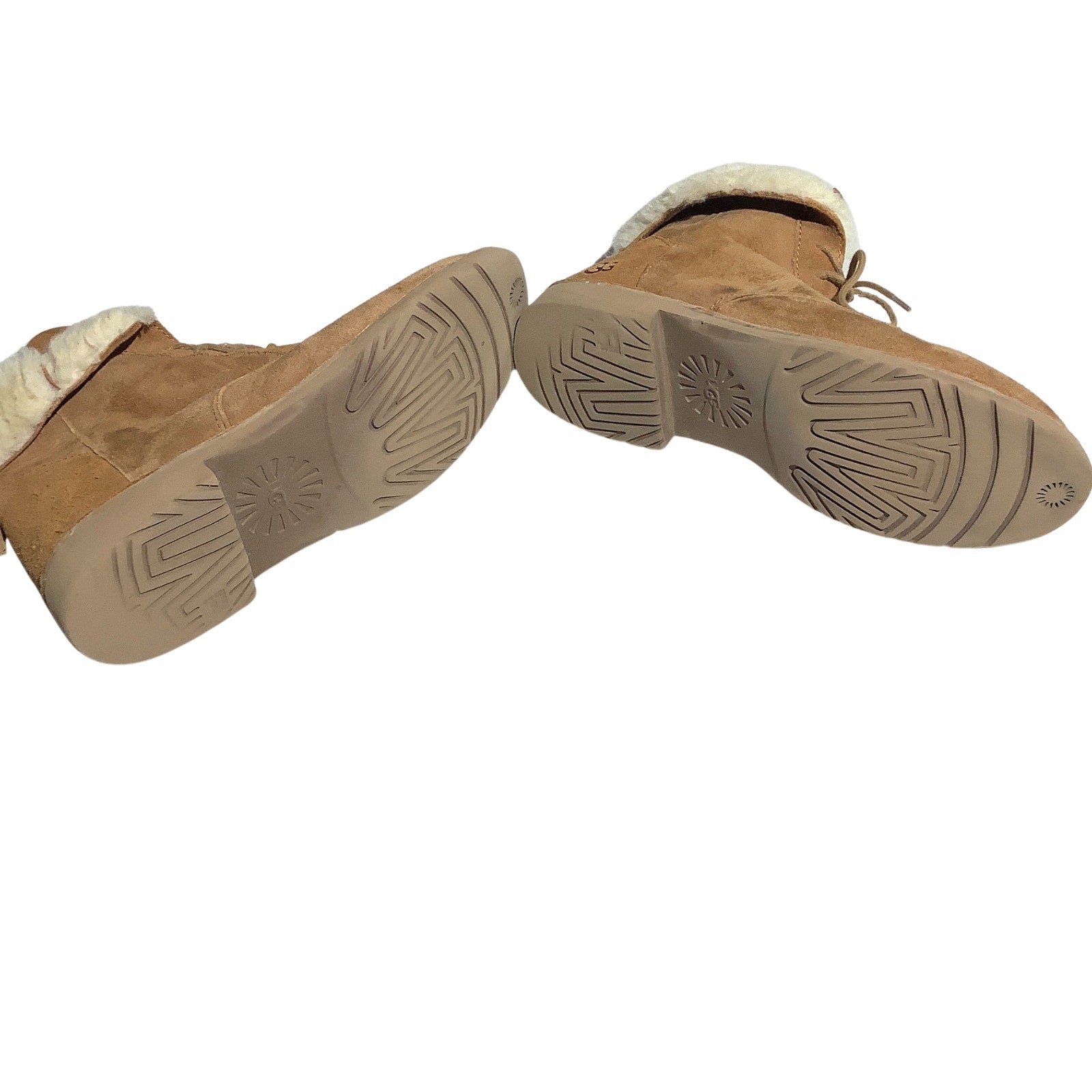These UGG Quincy boots in chestnut suede are a cozy winter essential in women’s size 10. Featuring a lace-up design and genuine shearling lining, they offer warmth, comfort, and classic UGG style. The fold-down collar reveals plush fur trim, making them both practical and fashionable. Show some visible wear (see photos).