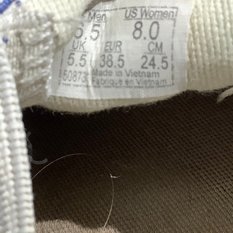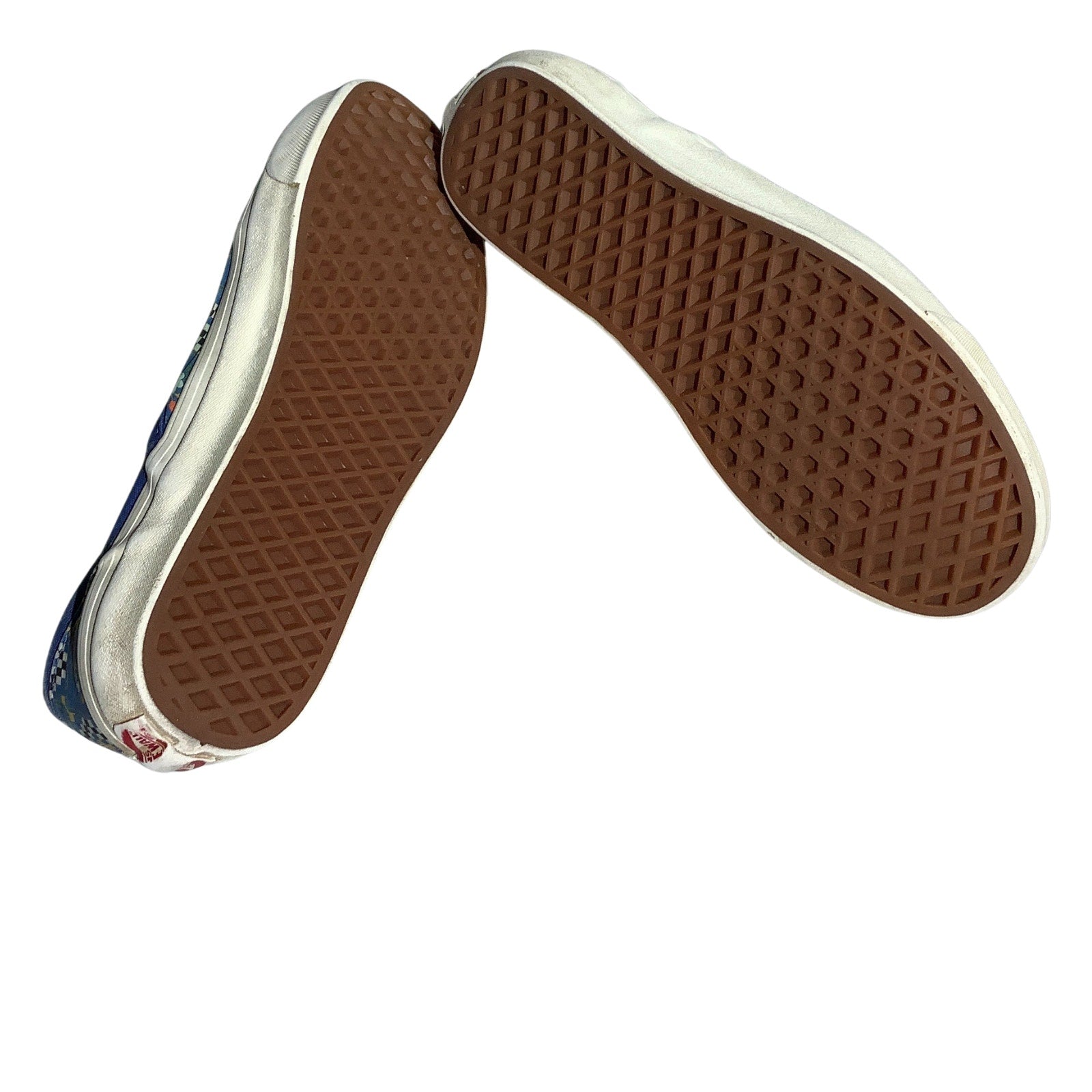 These Vans Anaheim Factory Slip-On shoes feature a vibrant blue tile pattern with retro-inspired details. Marked as Men’s size 6.5 and Women’s size 8, these sneakers offer classic skate styling with elastic side accents and padded collars for easy wear and comfort. Show signs of wear, particularly on the insoles (see photos).