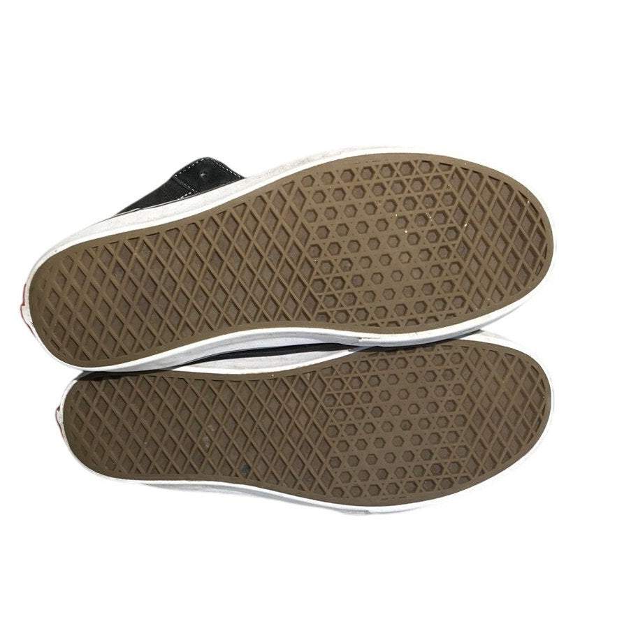 These classic black Vans high tops bring all the iconic style with a lived-in look. Designed with the signature side stripe and durable canvas/suede upper, these sneakers are perfect for everyday streetwear. Please note: no laces included and there’s a small tear on the sole in two spots—see photos for detail.