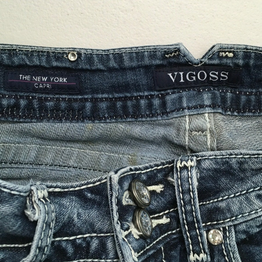 These VIGOSS New York Capri Jeans bring bold style and Y2K-inspired glam with their embellished back pockets and faded blue wash. Featuring a flattering slim fit and double-button waist closure, these jeans offer a trendy yet comfortable silhouette. The rhinestone-studded pocket detailing makes them a standout choice for those who love a little extra sparkle in their streetwear looks.