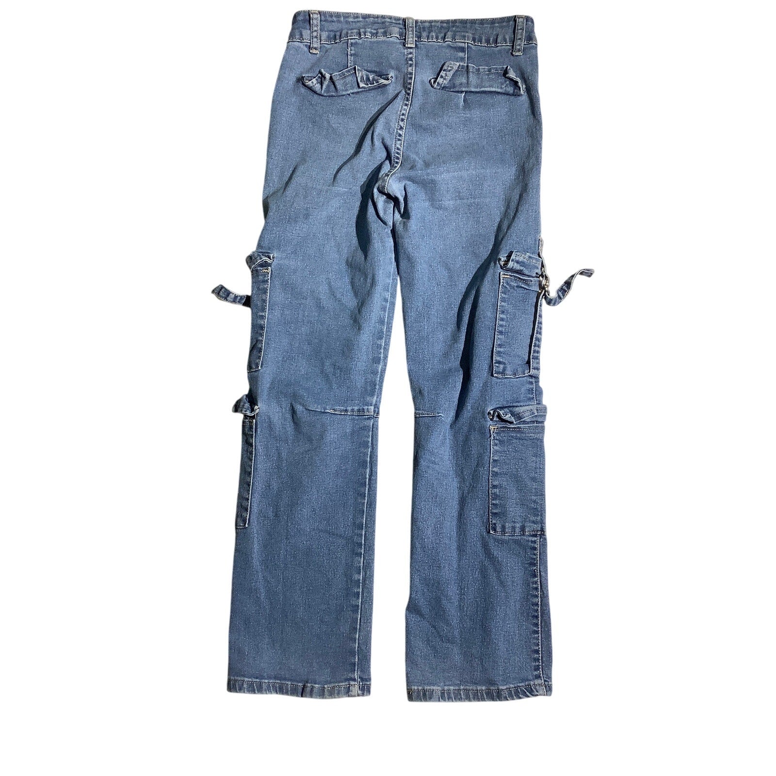 VIP Jeans kids's cargo jeans in denim blue, size 14. Designed with multiple cargo pockets, tie-strap detailing, and a straight-leg fit. These jeans blend utility and style, perfect for casual streetwear looks or practical everyday wear.