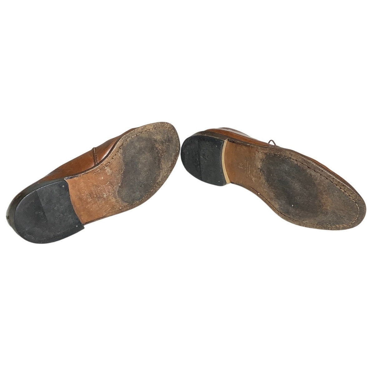 These Vito Rufolo dress oxfords in men’s size 9.5M are crafted in Italy from genuine brown leather with elegant hand-stitched detailing. Featuring a lace-up design and leather soles, they offer a timeless and sophisticated look perfect for formal events, work, or dressy occasions. Signs of creasing and wear (see photos).