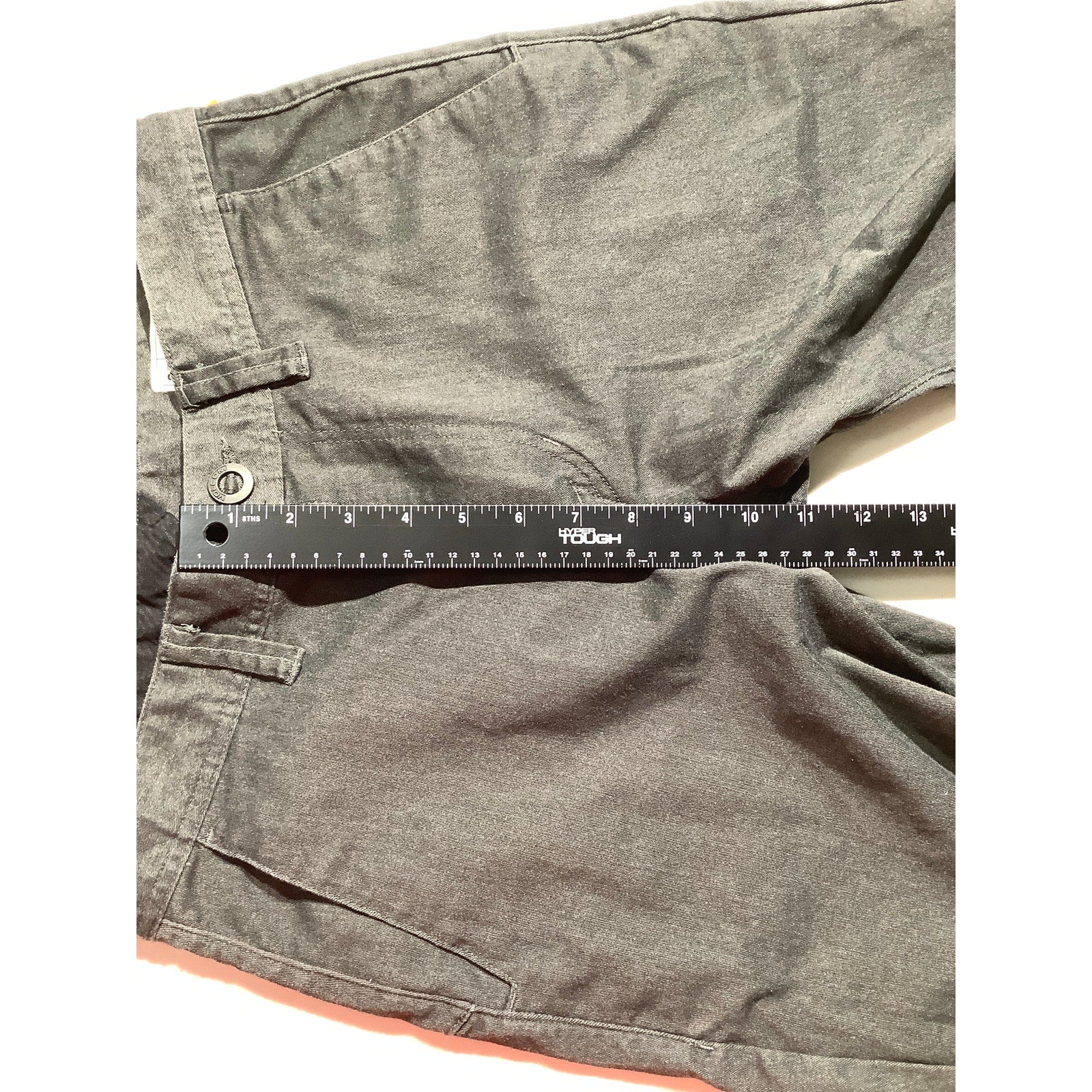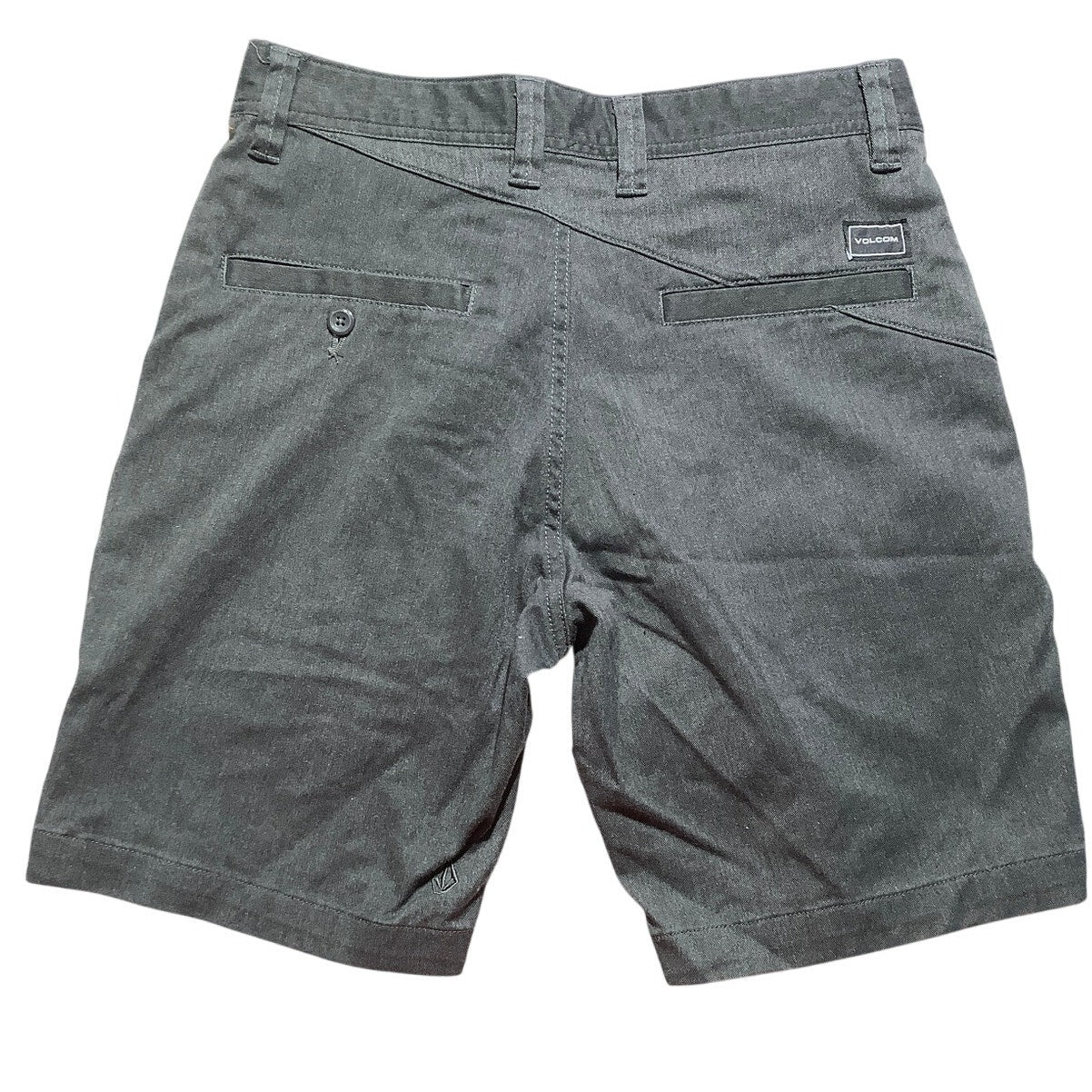 These Volcom men's shorts in size 28 feature a sleek dark charcoal color with a lightweight, breathable fabric. Designed for comfort and versatility, they offer a flat front style, side pockets, and buttoned back pockets. Perfect for casual outings, skate sessions, or warm-weather wear.
