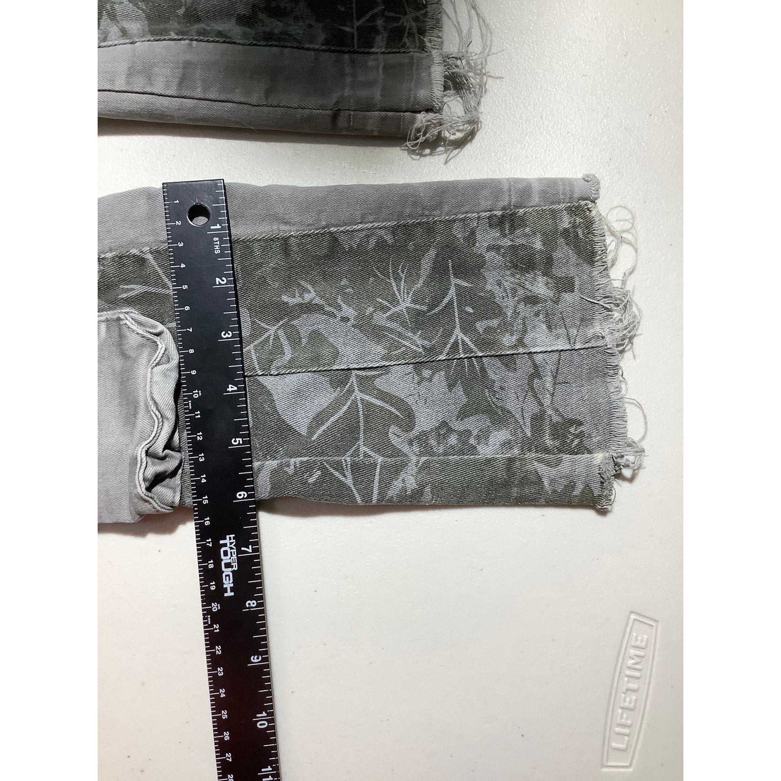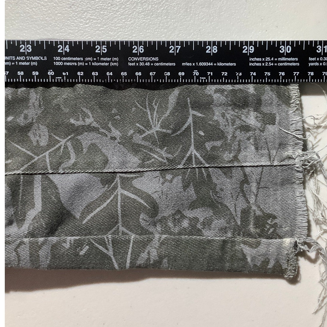Waimea Kid's woodland camo print cargo pants in size 14. These pants feature a unique mix of light and dark green camouflage with multiple utility pockets and a raw hem for an edgy finish. Perfect for casual wear, outdoor activities, or a bold streetwear look.