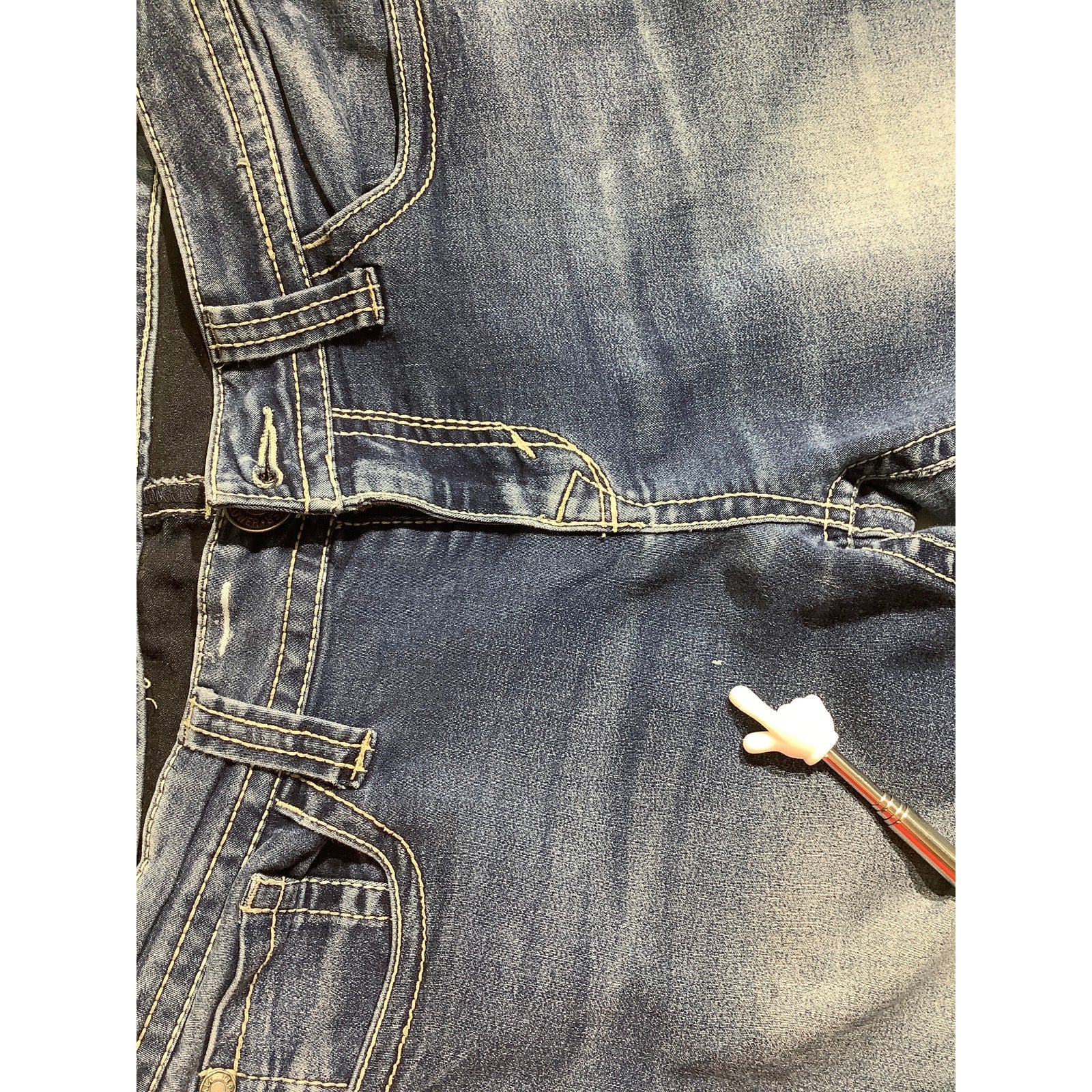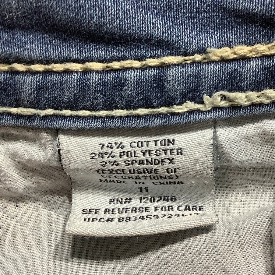 These Wallflower skinny jeans in women’s size 11 feature a modern distressed look with ripped knee details and decorative stitching on the back pockets. Crafted from a comfortable stretch denim, they offer a flattering fit perfect for casual, laid-back days.