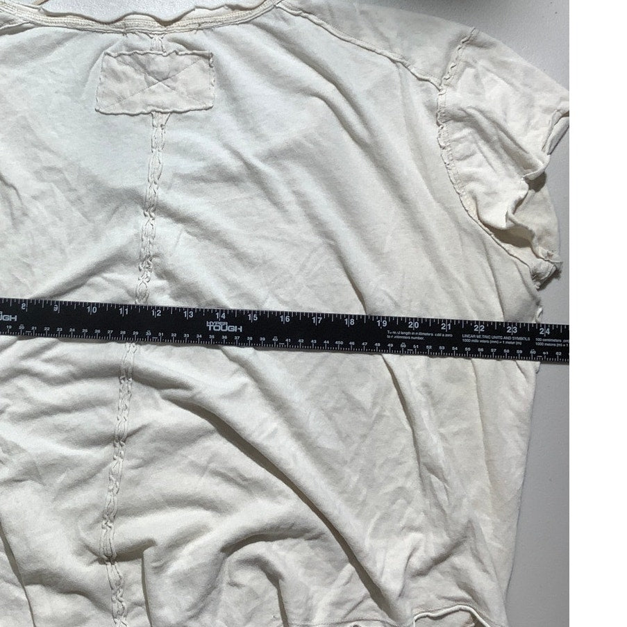 This We The Free women’s short sleeve top in size large features a relaxed, flowy fit and an off-white color that pairs effortlessly with any wardrobe. Designed with a raw edge neckline, exposed seam details, and a slightly distressed hem, this piece offers an easygoing, boho-inspired vibe. Please note: there is a small hole at the bottom hem (see pictures).