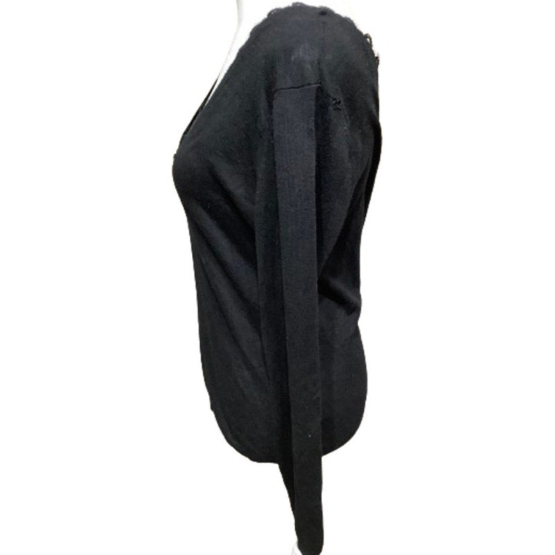 This Zara Knit black sweater is an elegant and feminine piece perfect for adding a touch of sophistication to your wardrobe. Made from a soft and cozy fabric blend, this sweater features a beautiful lace trim along the deep V-neckline, enhancing its chic and stylish appeal. Designed in size medium, the sweater has a comfortable fit with long sleeves and a relaxed silhouette, making it a versatile addition to any outfit.